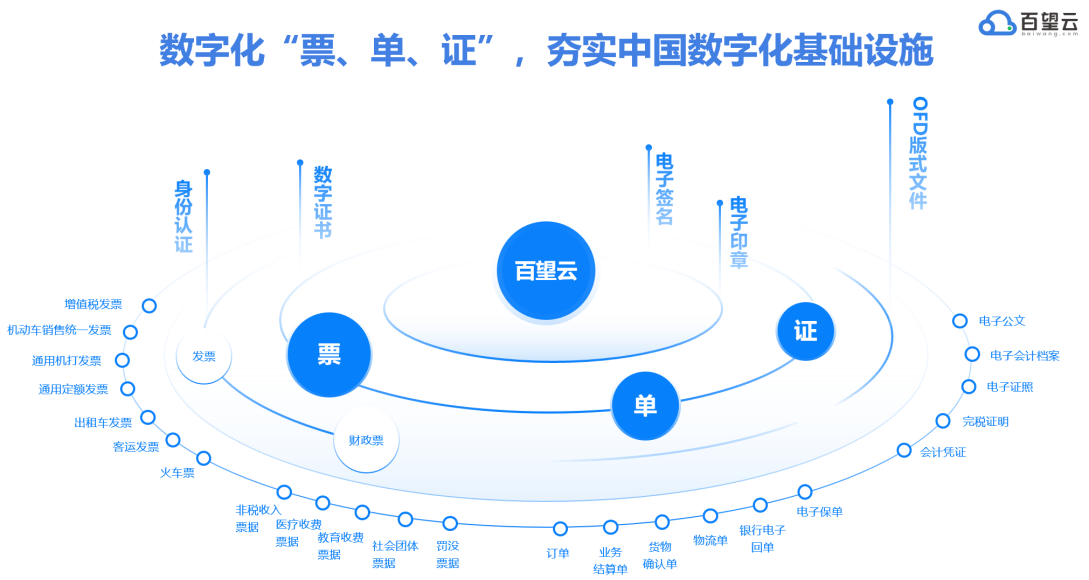 百望云以电子发票作为财税数据入口,致力于推动中国继“无现金支付”之后政府和企业的“票单证”数字化,推动数字中国的战略落地,全面打通企业与供应链、消费者、税务系统之间的联系,实现从企业证照、订单、对账结算、支付到发票的全链路数字化闭环。